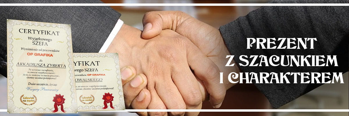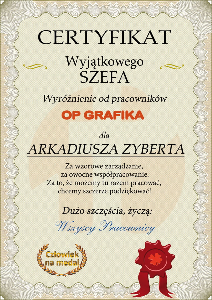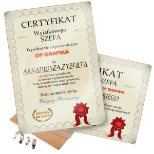 Certyfikat z podziękowaniami dla szefa, dzięki któremu w wyjątkowy sposób wyrazisz wdzięczność dla swojego szefa i sprawisz mu wyjątkowy prezent! Zamów nasz Certyfikat i zaskocz swojego szefa! Spraw żeby poczuł się wyróżniony i doceniony! Prezent w takiej formie okaże się super uznaniem i oryginalną pamiątką!