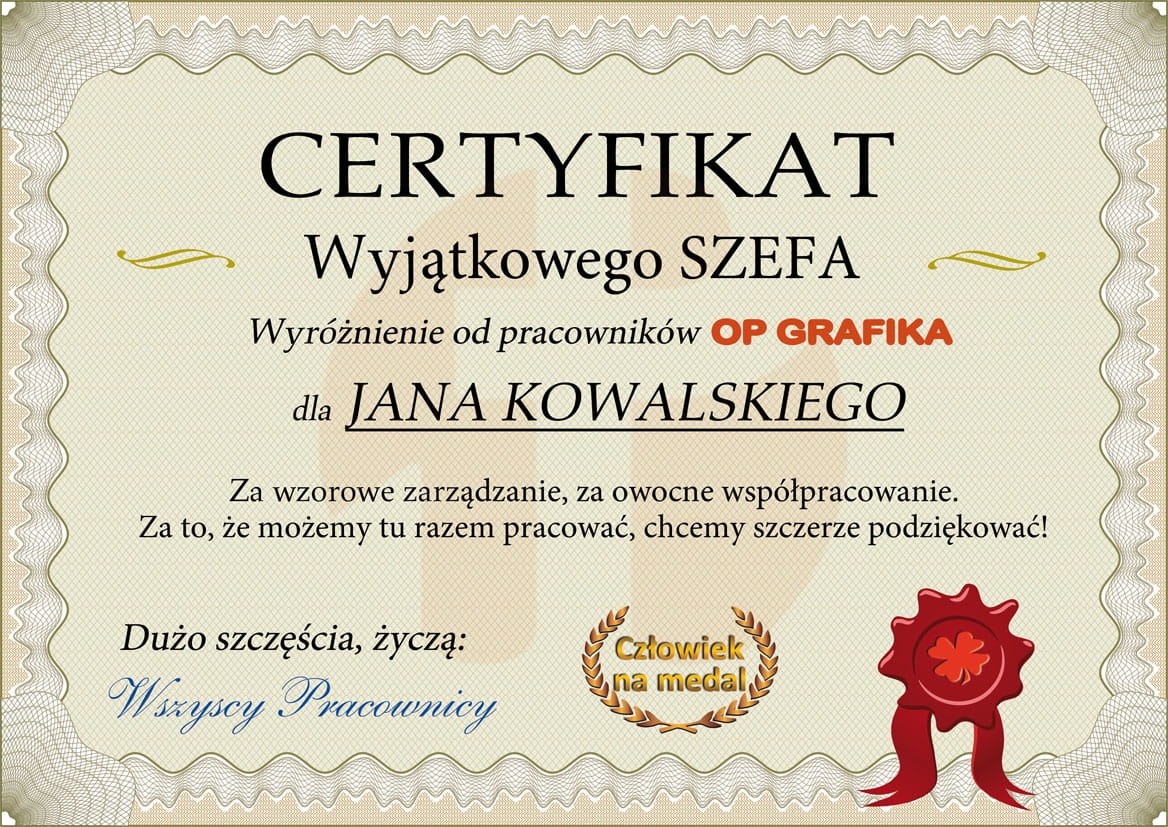 Certyfikat Wyjątkowego szefa - prezent, podziękowanie dla szefa