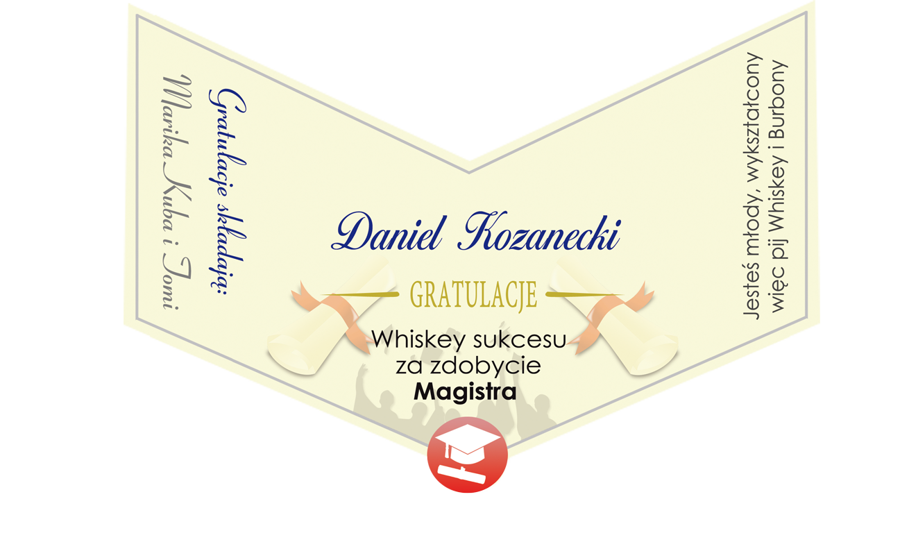 Naklejka na whisky z życzeniami z okazji ukończenia szkoły wyższej, studiów dla absolwenta: licencjata, inżyniera, magistra. Jeżeli chcesz zaskoczyć absolwenta/tkę, i sprawić mu/jej na prawdę oryginalny i wartościowy prezent, to nie mogłeś/aś lepiej trafić!