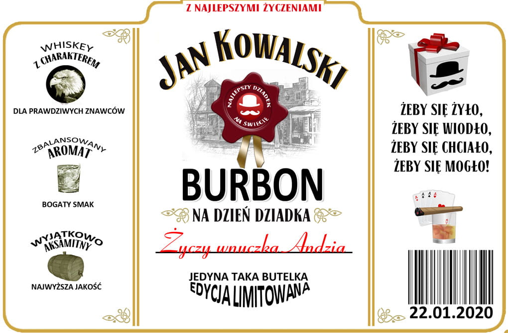 Świetny dodatek do spersonalizowania whisky na Dzień Dziadka! Personalizowana etykiet naklejona na ulubiony alkohol Twojego dziadka sprawi, że prezent zyska na atrakcyjności, a Twój dziadek poczuje się na prawdę wyróżniony!